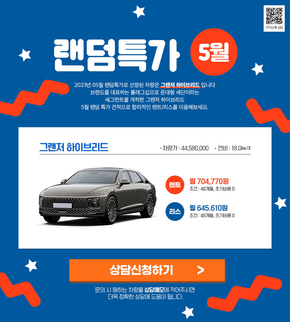 핫딜조건 2023년 5월 랜덤특가로 선정된 그랜저 차량을 합리적인 조건으로 만나보세요.