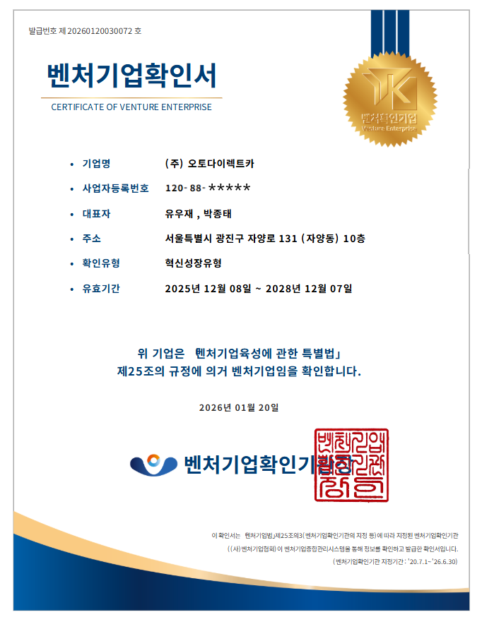 | 63 | [보도자료] 장기렌트·리스 전문 ‘오토다이렉트카’, 혁신성장유형 벤처기업 인증 획득 | 2026-01-20 | 조회수 : 1282 |